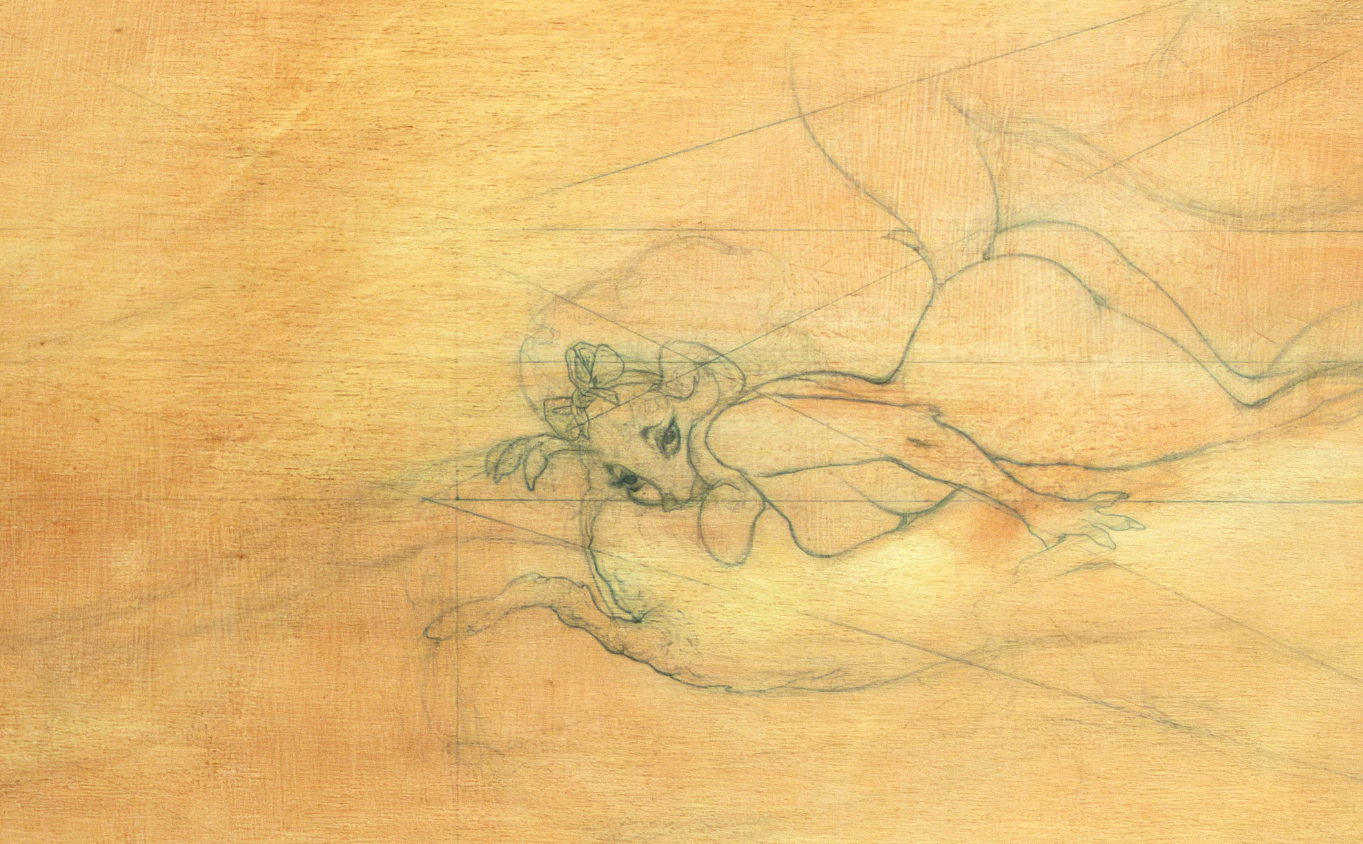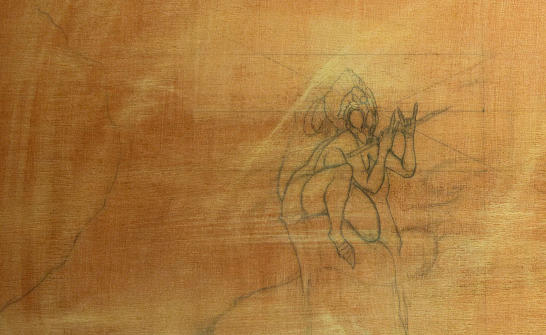 „Fistula-Maternitatis“ ist eine vorbereitende Skizze, die mit Bleistift auf einer mit Gesso grundierten Holzplatte ausgeführt wurde. Die Technik erlaubt es, feine Linien präzise auf dem festen Untergrund sichtbar zu machen. Der warme Ton des Holzes bleibt durch die transparente Grundierung leicht sichtbar und verleiht der Komposition eine natürliche Tiefe. Die Perspektivlinien und angedeuteten Volumen zeigen die sorgfältige Planung der Raumwirkung. Als Vorstudie für eine Geschichte diente das Werk als visuelles Konzept, das sowohl narrative als auch kompositorische Elemente miteinander verknüpft.