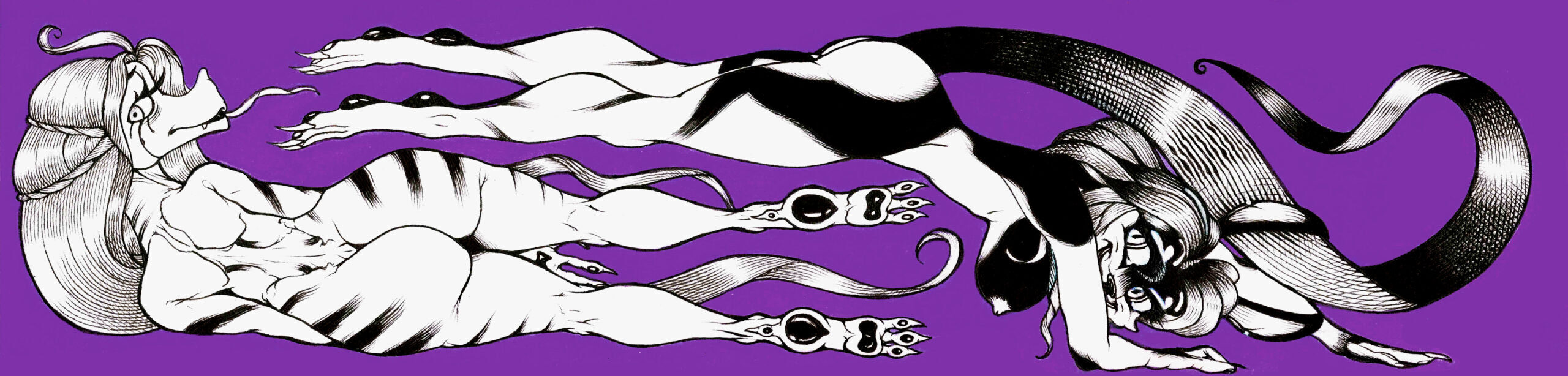 In der Arbeit „Segretion“ verschmelzen Tierisches, Menschliches und Maskerades zu einem grotesken Panoptikum der Körper. Die Figuren wirken fragmentiert und überzeichnet – sie setzen sich über klassische Geschlechterrollen, Normkörper und Identitätskategorien hinweg. Stattdessen entfalten sie ein eigenes Vokabular aus Gliedmassen, Ornament und Posen, das an Karneval, Fetischästhetik und Traumlogik erinnert.