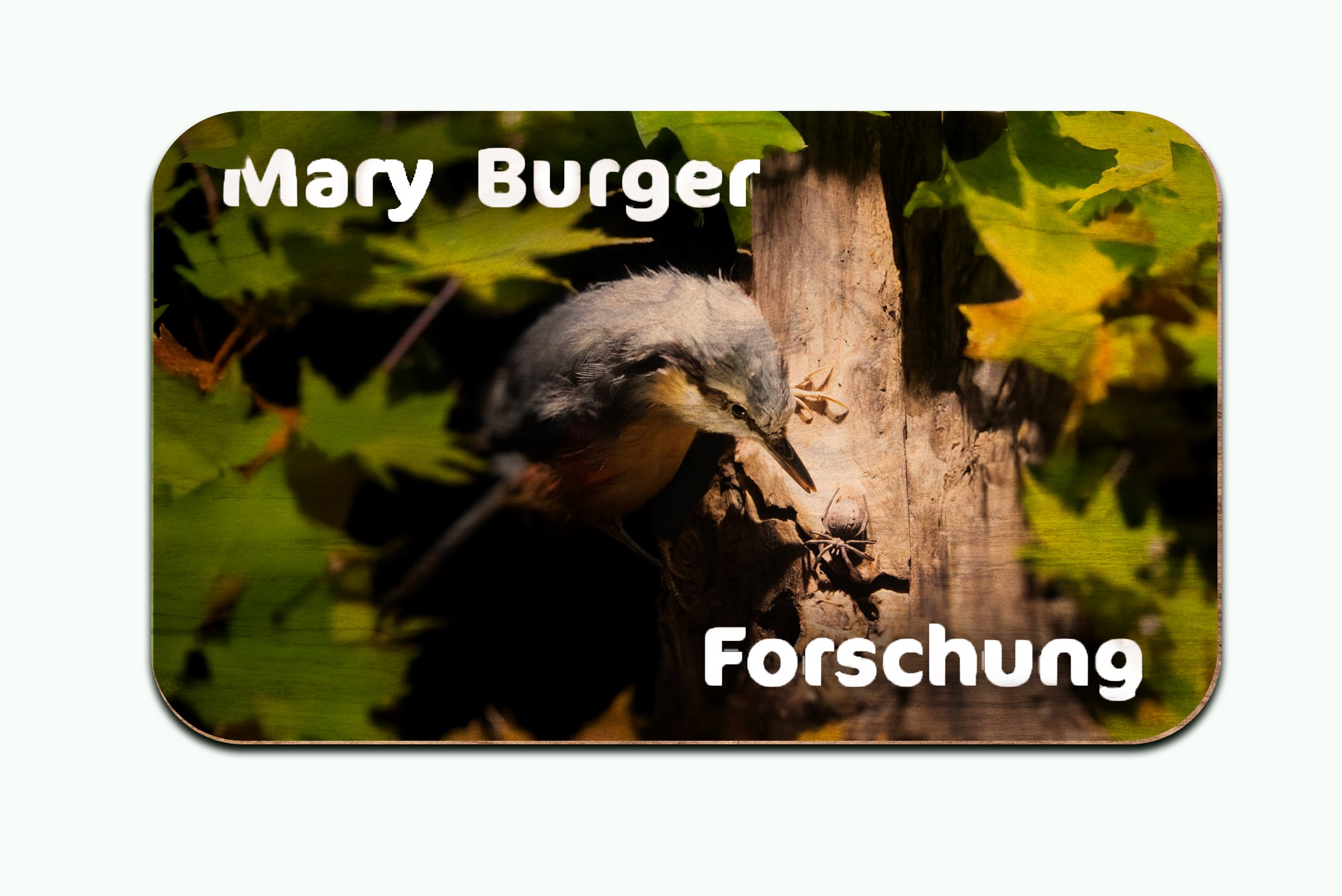 Jede mitarbeitende Person erhält einen individuellen Namens-Badge mit einem selbst gewählten Lieblingsvogel. Die Kombination von Fotografie und Name fördert Identifikation, Gespräch und Nahbarkeit – ein kleines Element mit hohem kommunikativen Wert. Gefertigt aus nachhaltigem Sperrholz, per Lasercutter und UV-Druck veredelt, entsteht ein hochwertiges, ökologisches und emotional wirksames Medium.