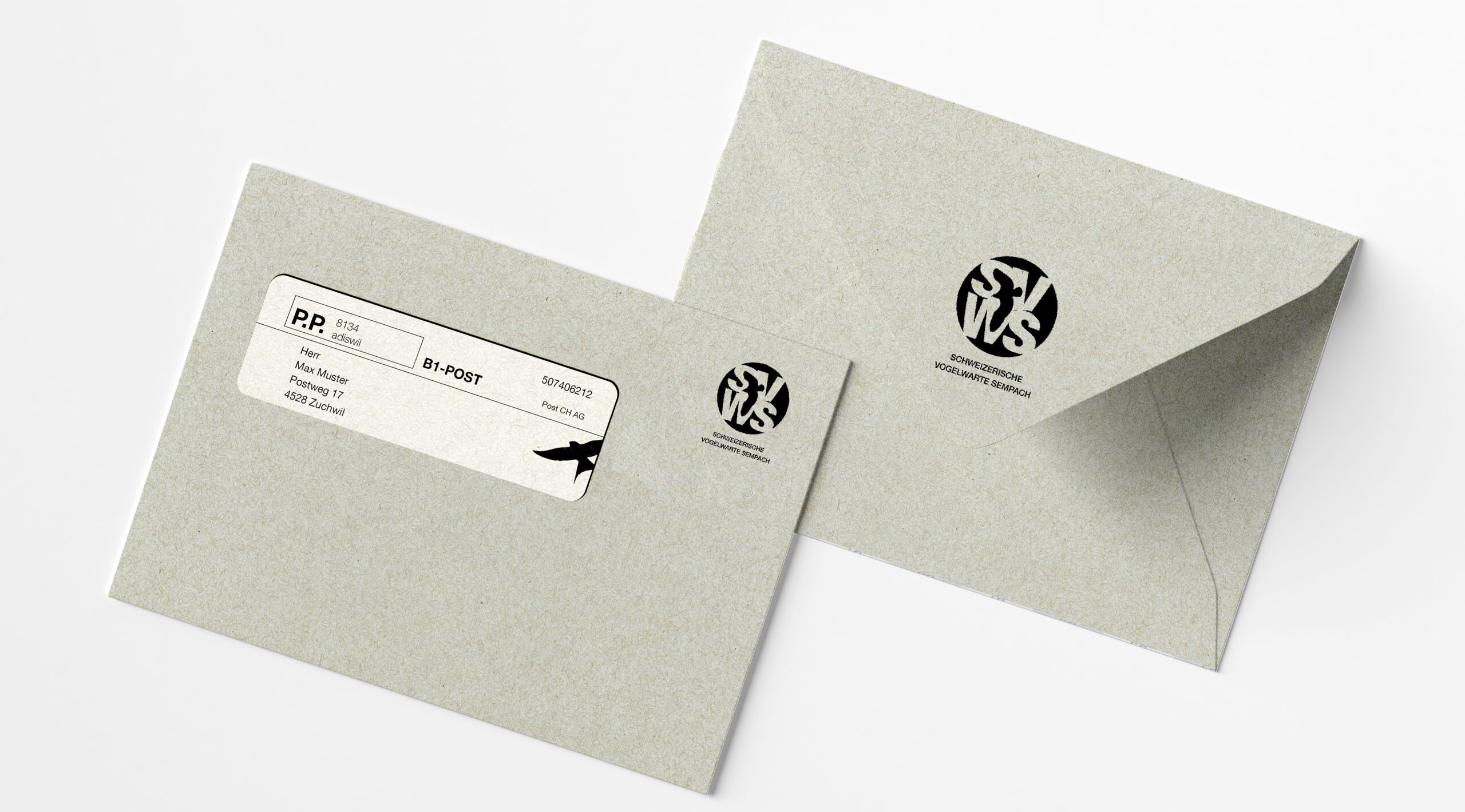 Die Briefschaften setzen auf Materialität und Reduktion. Gedruckt auf ungestrichenem, naturgrauem Papier mit sichtbarer Faserstruktur, entsteht ein stilles, respektvolles Erscheinungsbild. Ein zentrales Detail ist der kleine Vogel im Sichtfenster des Kuverts – eine erzählerische Geste, die das zentrale Designprinzip aufgreift: Durchblick statt Dekoration.